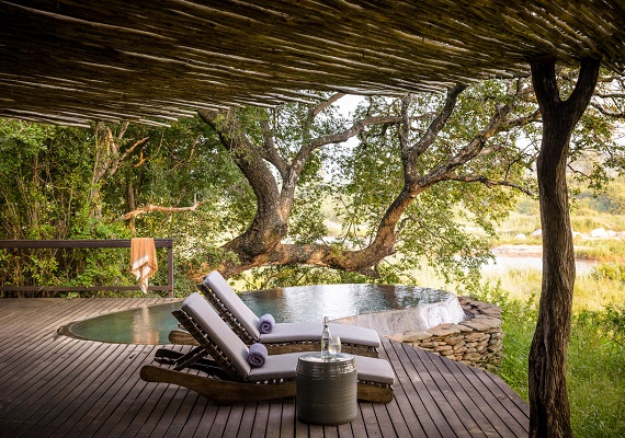 Each of the eight luxurious glass-fronted suites, complete with their own sundeck and rock plunge pool offer superb views of the African bushveld beyond. The suites are generously spacious with air-conditioning and overhead fans providing welcome respite against the harsh African heat. The breathtaking romantic bathrooms, which include double indoor and outdoor showers, have windows, which open to a glorious view of the passing cavalcade below. Whilst a special touch to each suite are the final touches provided, from weather notes and African poems, to a fine array of bath salts and other bathroom amenities. An inviting lounge with breathtaking views out over the bush and beyond creates the ideal setting to relax with a book or while away the afternoon with a pair of binoculars.